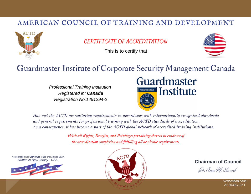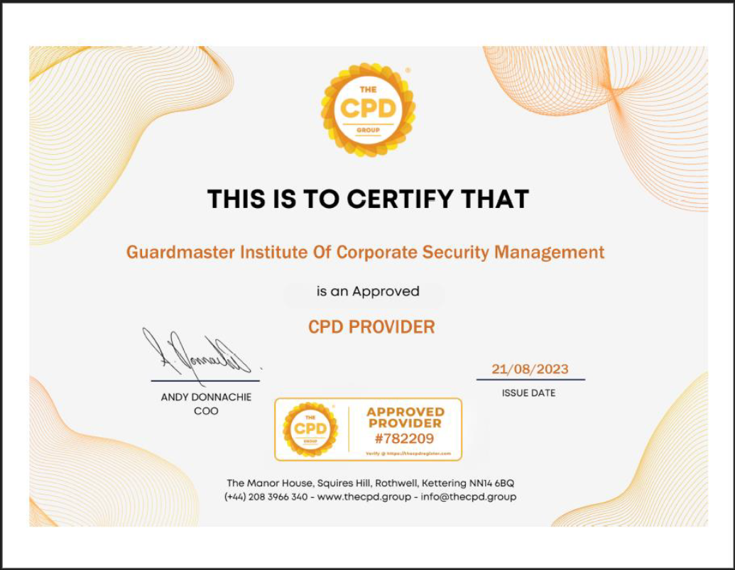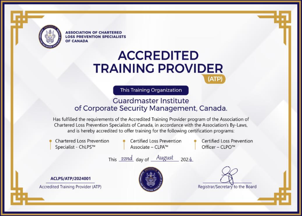 Guardmaster Institute of Corporate Security Management is an Accredited Training Provider of the Association of Chartered Loss Prevention Specialists of Canada. The Association of Chartered Loss Prevention Specialists of Canada is the official professional body dedicated to advancing loss prevention and asset protection practice in Canada. It sets standards, accredits training programs, and certifies professionals, through globally recognized certifications, best practices, and professional development initiatives.Certifications offered by the Association include CLPO™, CLPA™, CLPM™, and ChLPS™.